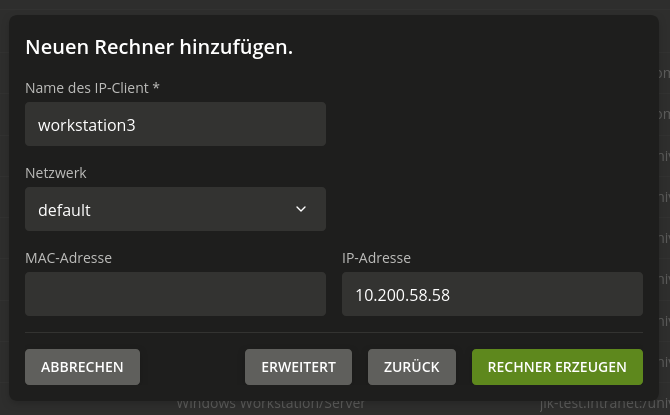 Wenn Sie dem Rechner ein Netzwerk zugewiesen haben, zeigt dieses Feld automatisch eine IP-Adresse aus dem Netzwerk an. Nubus verwendet DHCP, um die IP-Adresse an den Rechner zu übertragen. Wenn der Rechner kein DHCP verwendet, müssen Sie den Rechner lokal konfigurieren. Für Informationen über die lokale Netzwerkkonfiguration, siehe Netzwerk Konfiguration.