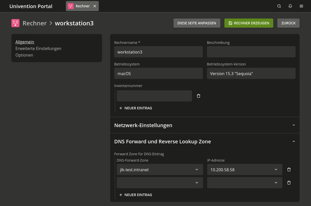 Die DNS Forward Zone für den Computer. Nubus verwendet die Zone, um den Computernamen in seine zugewiesene IP-Adresse aufzulösen. Für Informationen über die IP-Konfiguration, siehe Netzwerke Modul.
