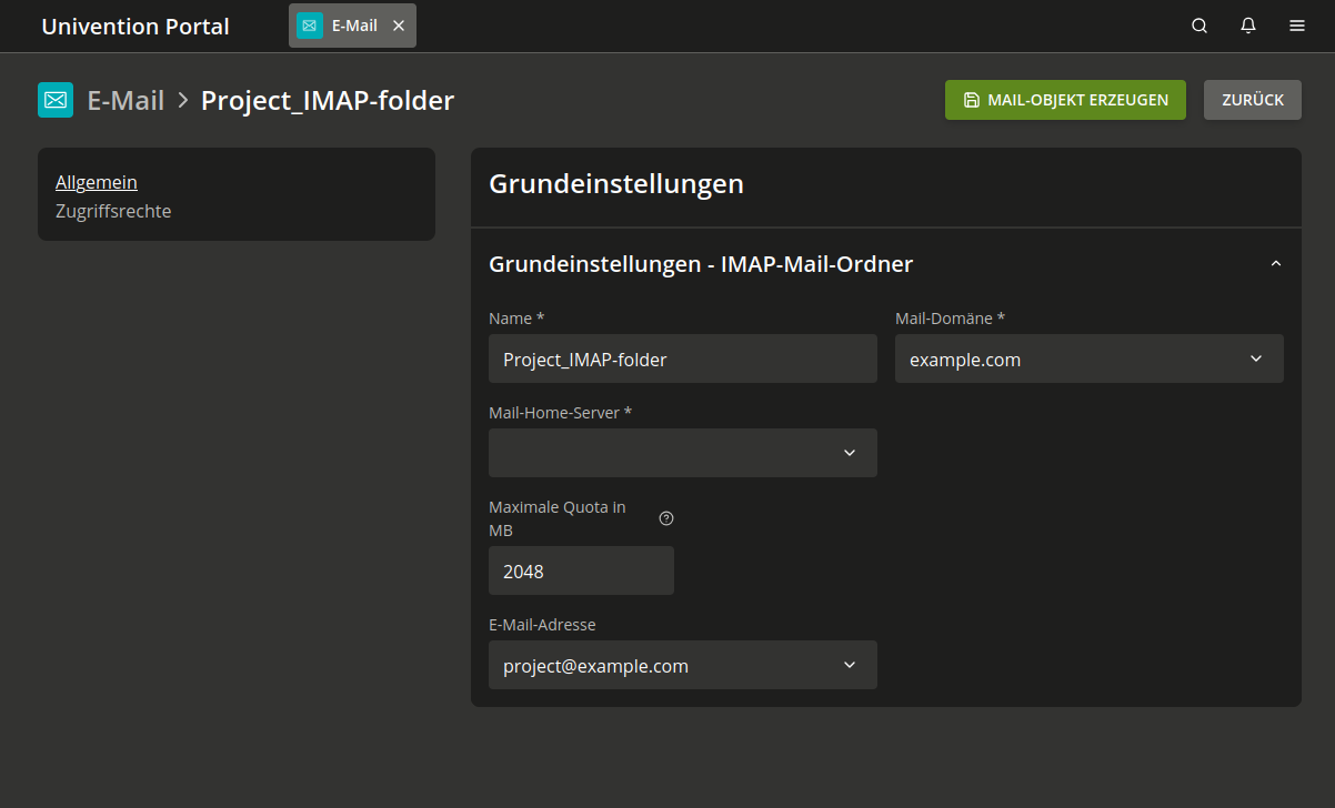 2. Füllen Sie das Formular aus, indem Sie die Attribute in den folgenden Abschnitten Reiter Allgemein - IMAP-Mail-Ordners und Reiter Zugriffsrechte - IMAP-Mail-Ordner angeben.