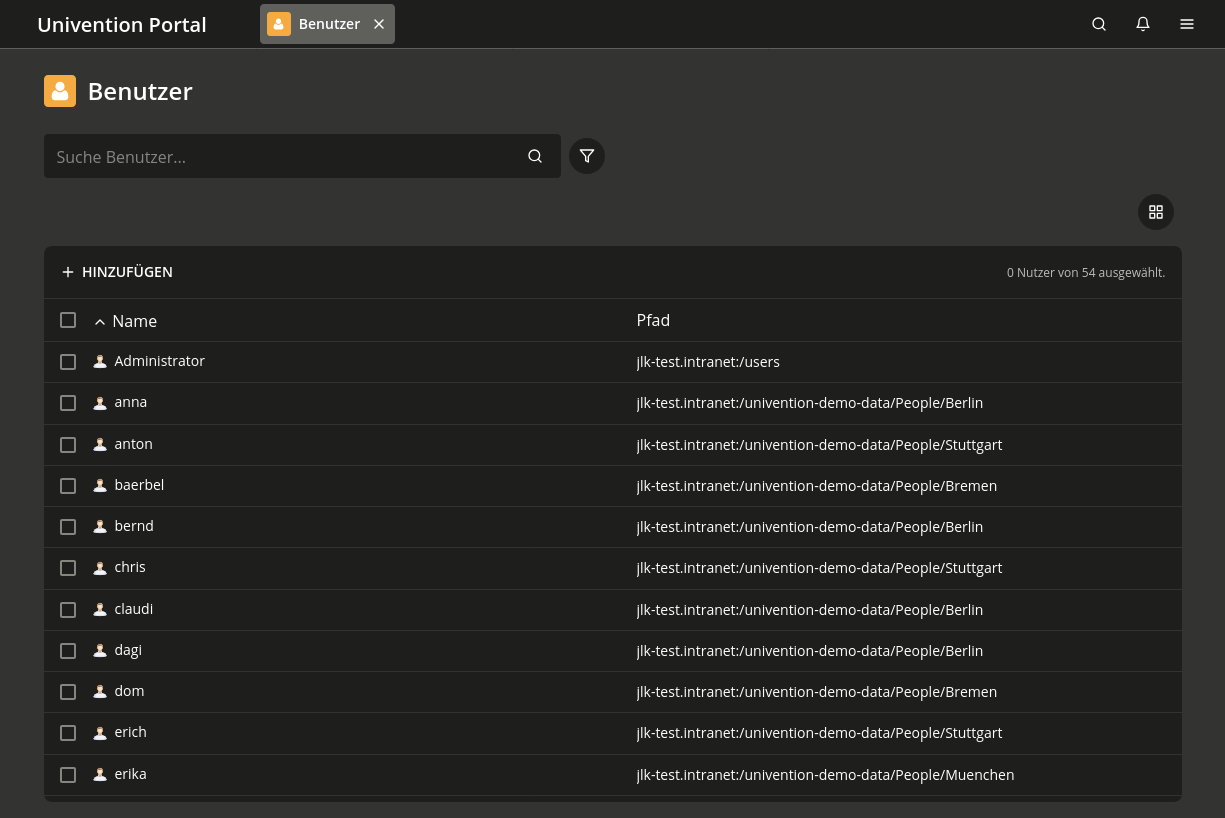 Wenn Sie ein Verwaltungsmodul öffnen, sehen Sie die Übersicht des Moduls, die alle Objekte auflistet, die ein Modul verwaltet, wie in Abb. 4.2 gezeigt. Die Such Operation führt eine Suche nach einer Auswahl wichtiger Attribute durch. Zum Beispiel im Benutzer Verwaltungsmodul nach Benutzerkonto-Objekten nach Vorname, Nachname, primärer E-Mail-Adresse, Beschreibung, Mitarbeiternummer und Benutzername. Sie können auch eine Suche mit Platzhalter durchführen, zum Beispiel m*.