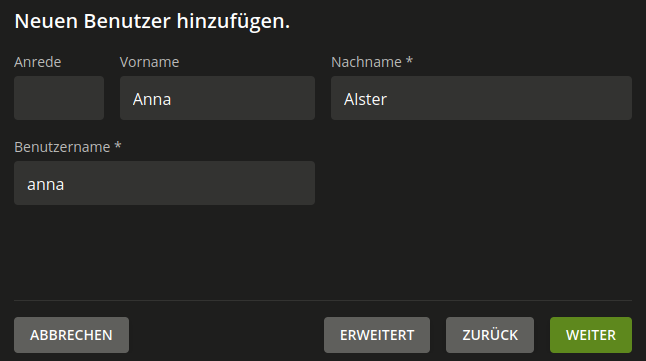 2. Geben Sie Werte für die Pflichtfelder Nachname und Benutzername an. Füllen Sie die optionalen Felder nach Belieben aus, wie in Abb. 5.1 gezeigt. Klicken Sie Weiter.