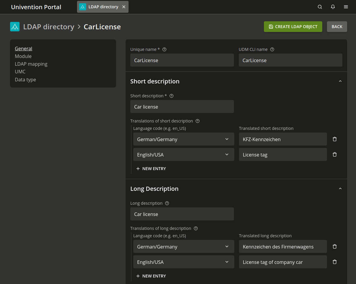 You can save translated short descriptions in several languages so that Nubus shows the title of extended attributes also with other language settings in the respective national language. You need to assign the respective short description to a language code, for example