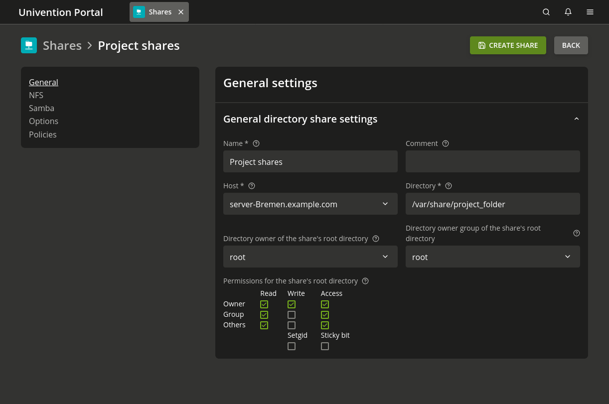 Nubus offers the Shares management module to manage file shares on UCS appliances through Samba and NFS.
