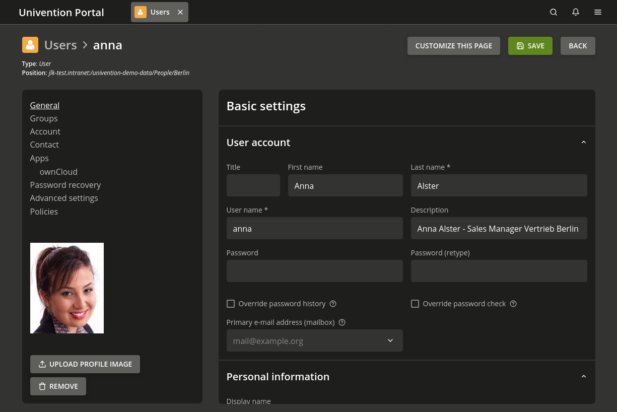 Nubus automatically generates the display name from the first name and the last name. Usually, you don’t need to change it. Among other things, the synchronization with Microsoft Active Directory and Samba use the display name.