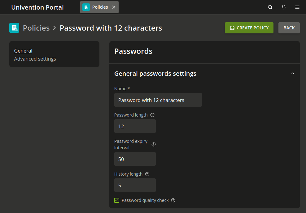 Administrators can define the minimum password length, the expiry interval and the password history length through password policies in the Policies module in the Management UI.