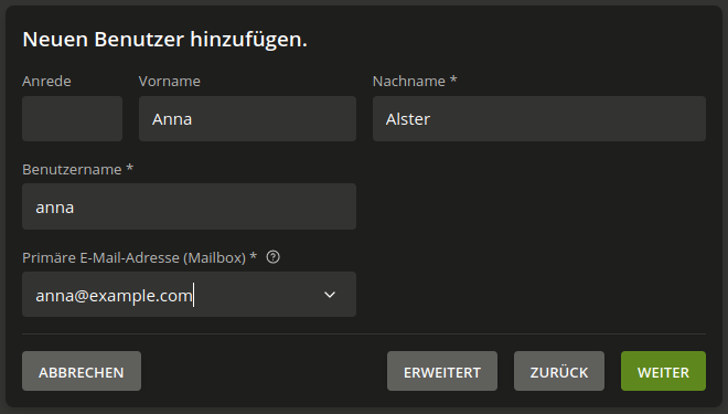 Geben Sie Werte für die Pflichtfelder Nachname und Benutzername an. Füllen Sie die optionalen Felder nach Belieben aus, wie in Abb. 5.1 gezeigt. Klicken Sie Weiter.