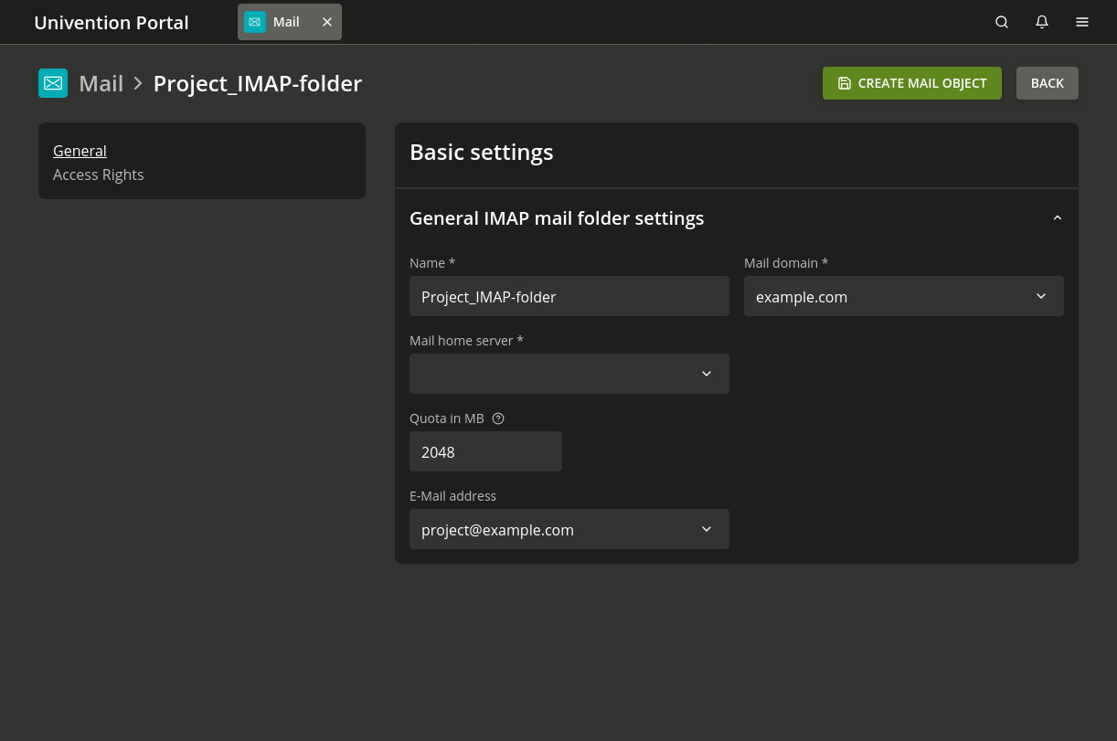 2. Fill out the form by providing the attributes in the following sections General tab - Shared IMAP folder and Access rights tab - Shared IMAP folder.