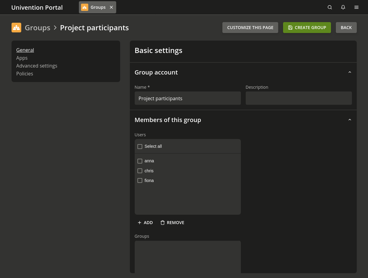 In Nubus, you manage groups through the Groups management module. You find the module in the Domain category of the Management UI Fig. 6.1 shows the module for creating a group. The following sections describe the tabs in the Groups management module: